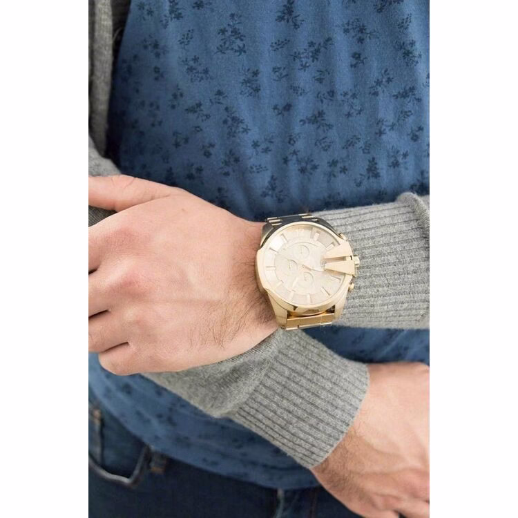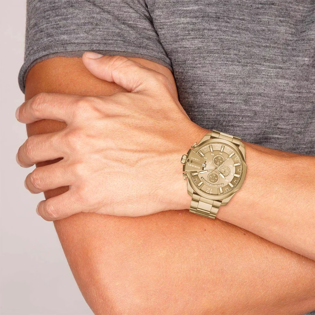 Diesel DZ4360 — масивний чоловічий годинник, який відразу кидається в очі. Корпус близько 51 мм і повністю золотий сталевий браслет створюють дуже виразний, “важкий” образ — це точно не про скромний мінімалізм.